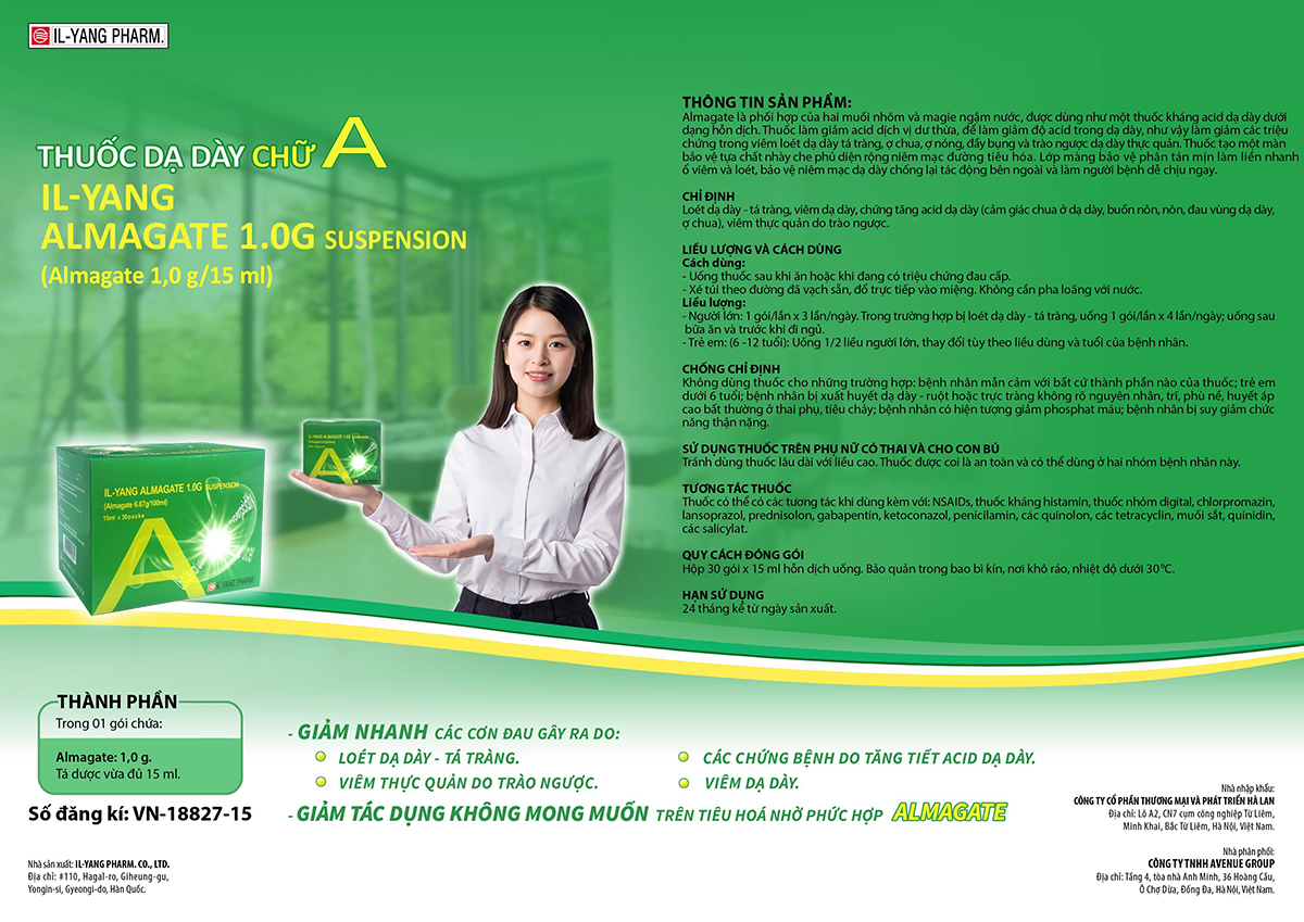 IL-YANG ALMAGATE 1.0G Suspension là thuốc dạ dày được sản xuất bởi IL-YANG PHARM Co., Ltd – Hàn Quốc, với công thức đặc biệt từ Almagate, sự kết hợp của muối nhôm và magie dạng hỗn dịch, giúp trung hòa axit nhanh chóng và bảo vệ niêm mạc dạ dày hiệu quả.