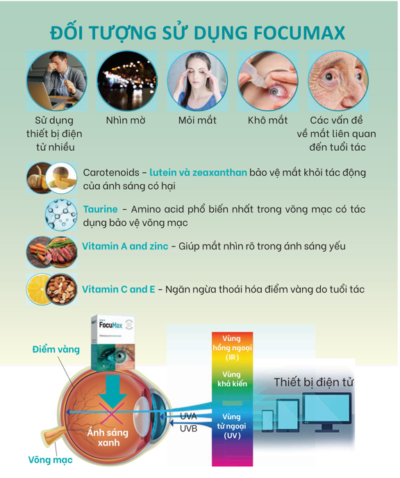 FocuMax thích hợp cho người có thị lực yếu, người thường xuyên làm việc với máy tính dẫn đến mỏi mắt, hoặc những người có nguy cơ gặp các vấn đề như thoái hóa điểm vàng và đục thủy tinh thể.