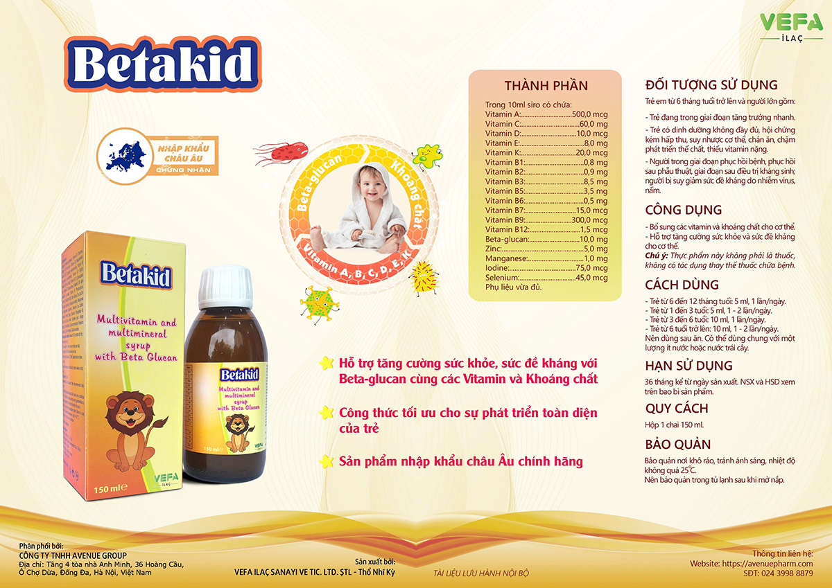 Betakid là siro bổ sung đa vitamin (A, C, D, E, K, nhóm B) cùng khoáng chất và Beta-Glucan, được nhập khẩu chính hãng từ Châu Âu (hãng VEFA İLAÇ, Thổ Nhĩ Kỳ). Sản phẩm đã được kiểm định chất lượng nghiêm ngặt, phù hợp cho trẻ em từ 6 tháng tuổi và cả người lớn, đặc biệt là những đối tượng có nhu cầu tăng cường đề kháng, hỗ trợ phát triển thể chất và trí tuệ. Với công thức tối ưu, Betakid giúp bù đắp lổ hổng dinh dưỡng, tăng cường hệ miễn dịch và thúc đẩy quá trình phát triển toàn diện ở trẻ nhỏ.