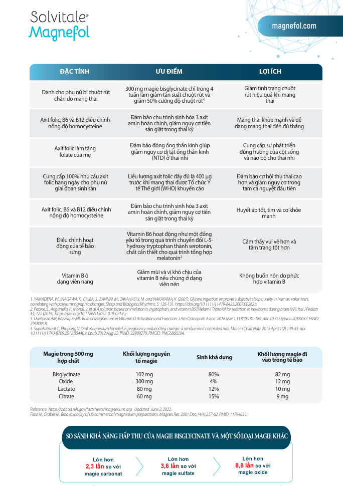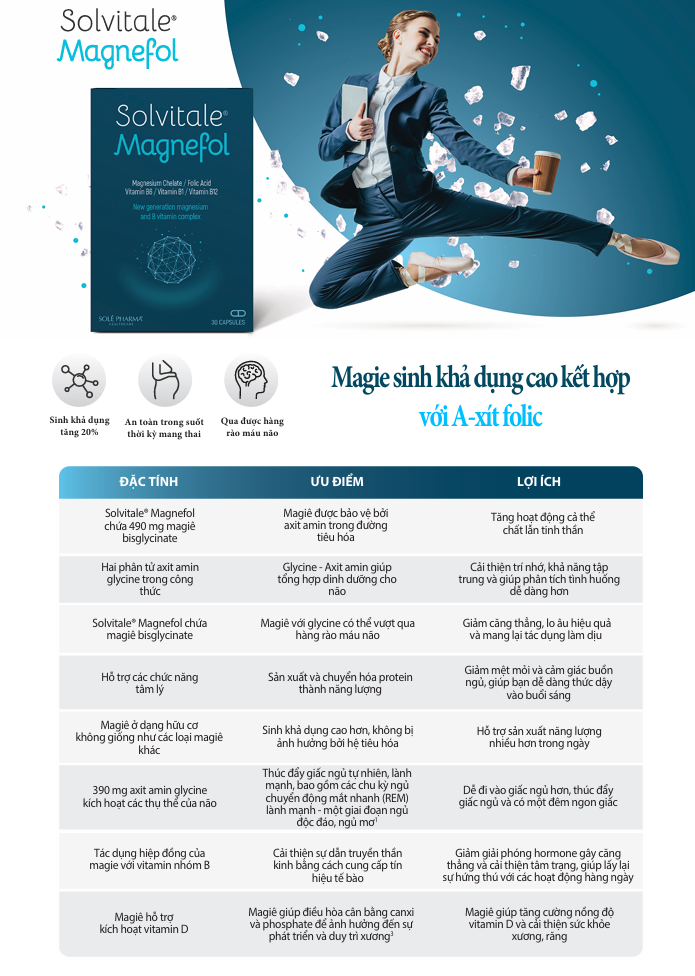 Cung cấp năng lượng cho tế bào, hỗ trợ chức năng thần kinh và cơ bắp, giảm mệt mỏi, đau đầu, chuột rút và run cơ.